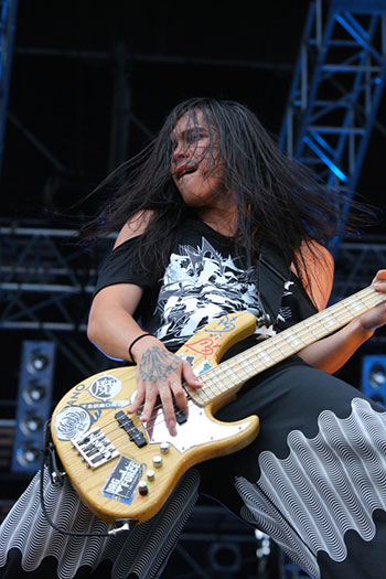 緊張感高まるSEが鳴り響き、メンバーが登場するとフィールドから大きな歓声がわき起こる。彼らのステージの1曲目、起爆剤のように投下されたのは『Fallen Idols』! SHOW-HATE(g)のギターの一音、たったそれだけが鳴るだけで会場のテンションの高ぶりが伝わってくる。全身真っ黒の衣装に身を包んだMAH(Vo)が重厚感あるレゲエサウンドにオーディエンスをどっぷりと浸からせていく。「本物を嗅ぎ分けろよ!」、MAHの言葉に煽られ、観客のテンションは天井知らずに上がっていく。「フェスでやるのは久しぶりです」と、次曲『JACK.B』へ。巨大なウォールオブデスが幾度となく作られ、ダイブやモッシュが次々にわき起こる。重厚感あるサウンドを観客にぶつけ、真っ向勝負をかけてくるメンバーの表情は終始ご機嫌だ♪ SIN(Ba)とGODRI(Dr)の剛毅なリズムはオーディエンスのステップを止めさせない。